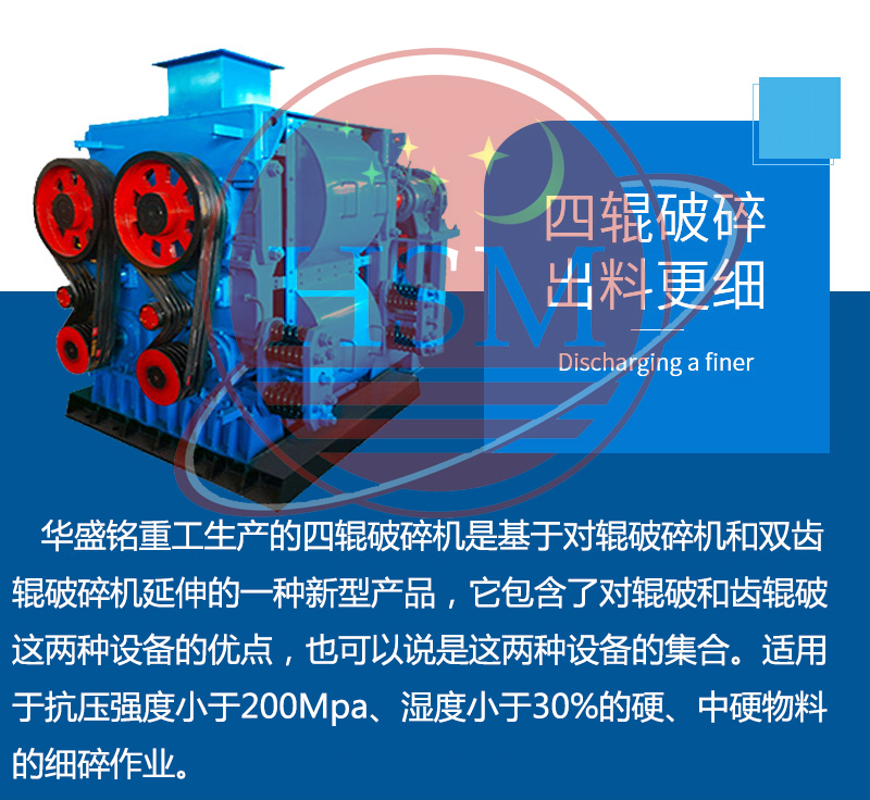 四辊破碎机也叫四齿辊破碎机,是一种冶金矿山设备配套中、细碎产品,适用进料粒度<90mm、成品粒度要求100目至5毫米的超细碎作业。四个辊面分为堆焊辊面或者平辊面,按照用户要求粒度选择组合,该设备具有结构紧凑,占地小,破碎比大、产量较高。